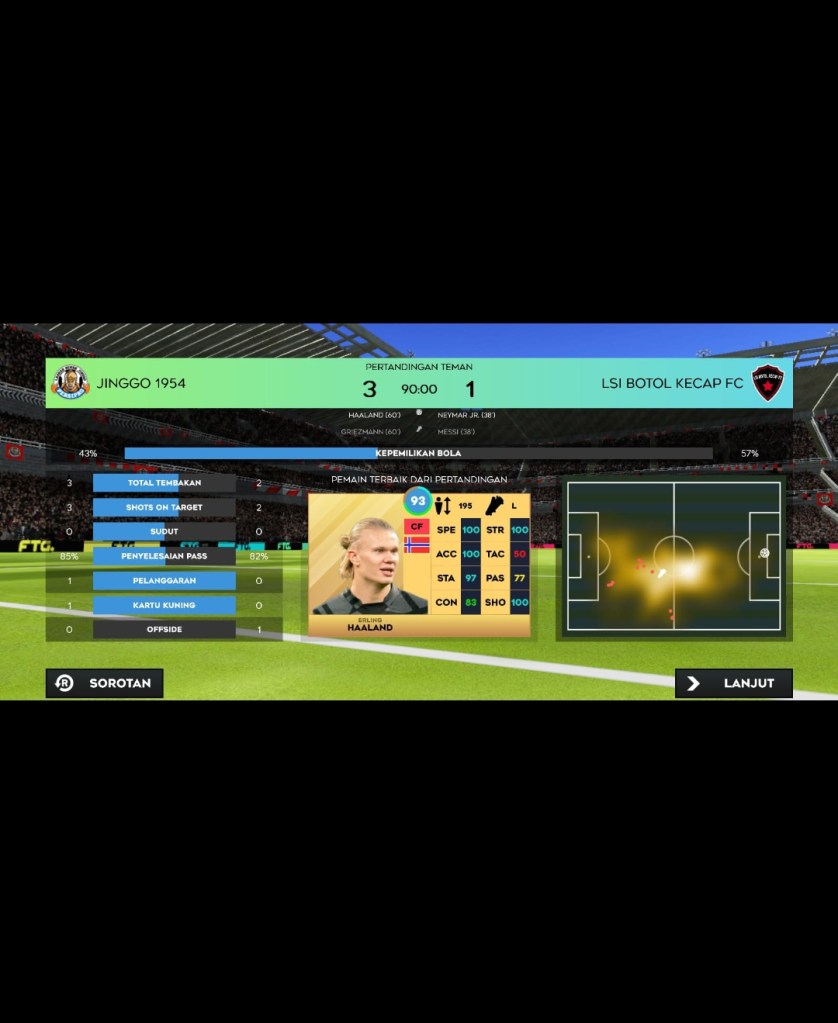 Setelah bermain kurang lebih 90 menit dalam game. Ahkirnya pertandingan usai dengan kemenangan jinggo 1954 dengan skor 3-1 atas LSI botol kecap FC.